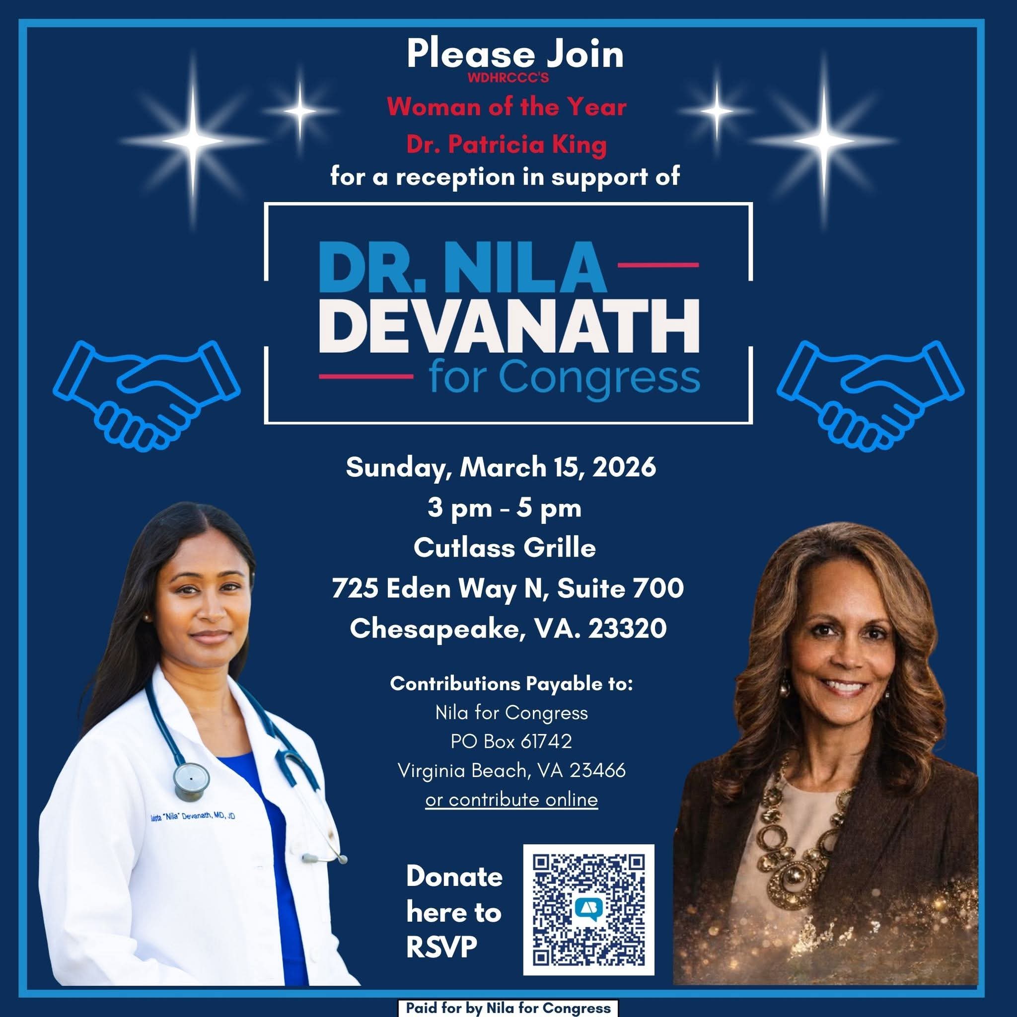 Join us this Sunday at our meet and greet in Chesapeake at the Cutlass Grille, hosted by Chesapeake City Councilwoman and Women's Division Hampton Roads Chamber of Commerce Chesapeake's Woman of the Year Dr. Pat King!